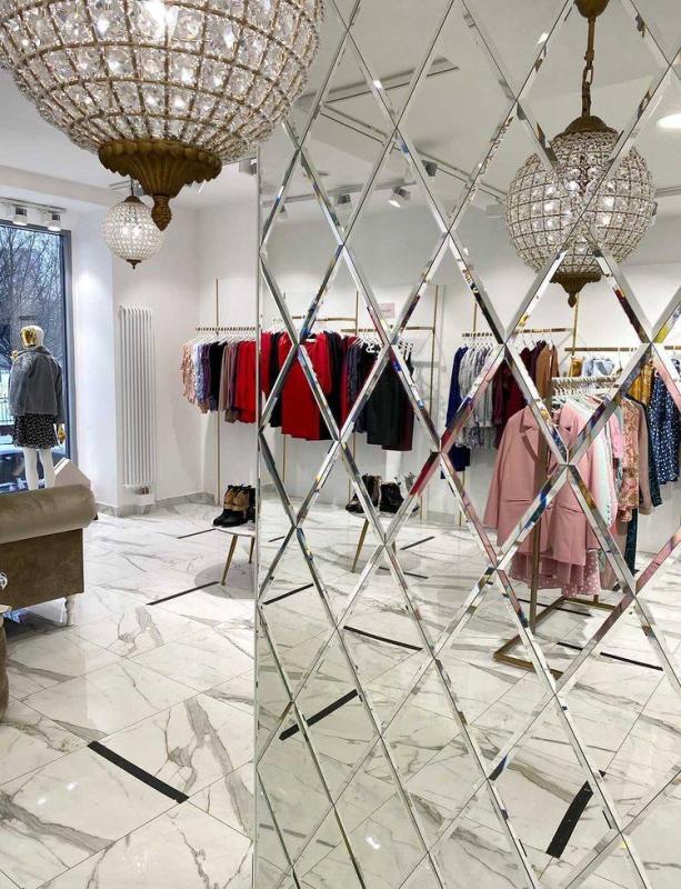Использована зеркальная квадратная и треугольная плитка с фацетом.